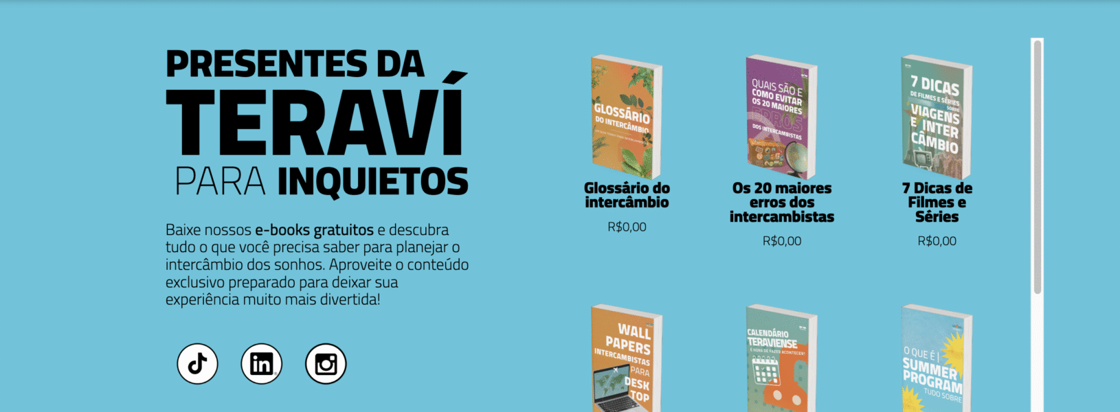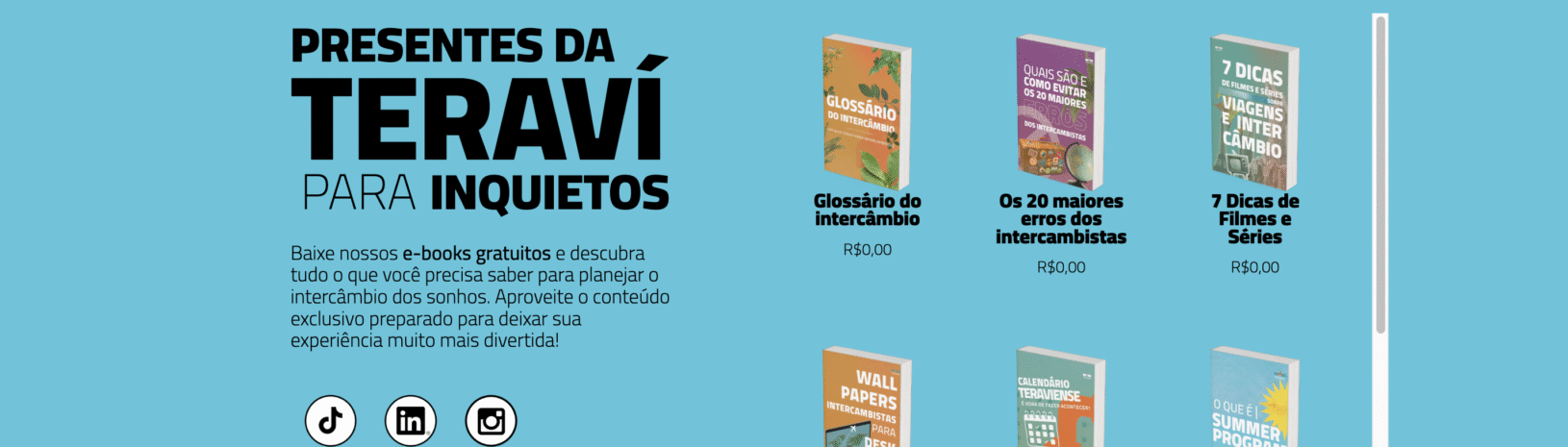 A página de eBooks da Teraví nasceu para ser o seu ponto de apoio durante todo o processo de intercâmbio. Mais do que reunir informações, ela entrega organização, clareza e até inspiração para quem está prestes a embarcar na aventura da vida.